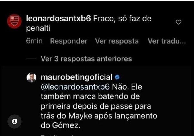 “Fraco. Só faz gol de pênalti”, disse um torcedor do Flamengo, que rapidamente teve seu comentário rebatido pelo comentarista da TNT Sports.“Ele também marca batendo de primeira depois do passe para trás do Mayke após lançamento do Gómez”, concluiu o jornalista, que além de falar com o meia teve um breve contato com a família do jogador.