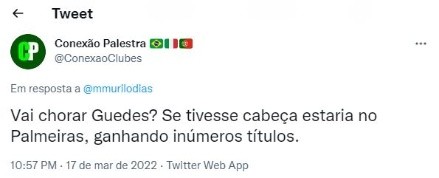 No entanto, causou surpresa a explicação de Roger Guedes para o lance. O jogador também concedeu entrevista e deixou claro que tudo não se passou de mal entendido, além de declarar seu carinho pelo Palmeiras, como gratidão ao Clube que ele atuou de 2016 a 2018: “O Weverton achou que eu tivesse zoado a torcida, mas a torcida viu que não fiz nada. Não provoquei. Pelo contrário, tenho carinho pelo Palmeiras. Fui campeão aqui, praticamente onde tudo começou”, declarou Guedes.