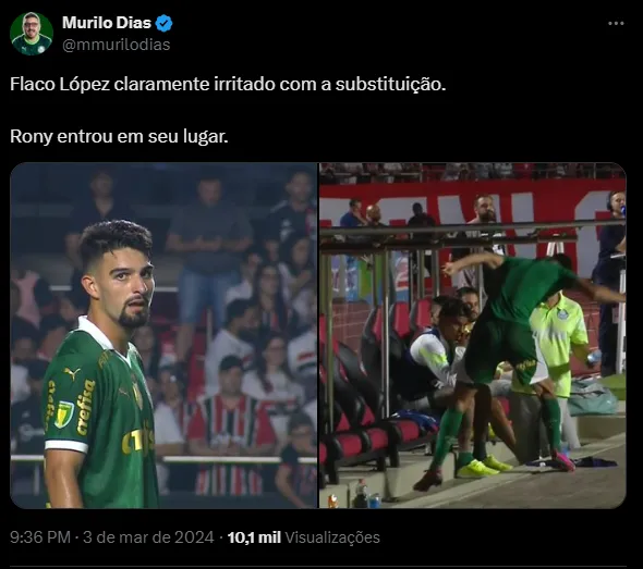 “Flaco López esta certissimo em ficar puto“, “Flaco Lopez sai irritado, e eu acho justo e compreensível“, “Agora vai ficar 10 jogos no banco, porque o Abel gosta de jogador bonzinho, cristão” e “Ninguém aguenta mais o Rony. E haja saco SAIR TODO JOGO pro Rony jogar“, foram alguns comentários.