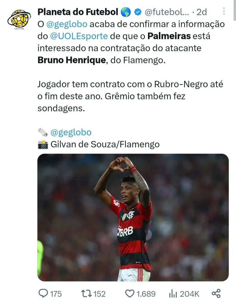 As negociações entre Bruno Henrique e Flamengo estão travadas no momento e segundo o Lance, o Palmeiras aguarda para entender os movimentos na Gávea. A expectativa é que após o Flamengo esgotar sua possibilidades de negociação com o atleta, aí sim a diretoria do Palmeiras fará uma proposta oficial pelo craque que é um dos destaques do clube carioca. E o próprio Verdão entende que o resultado da final pode interferir no desfecho da negociação.