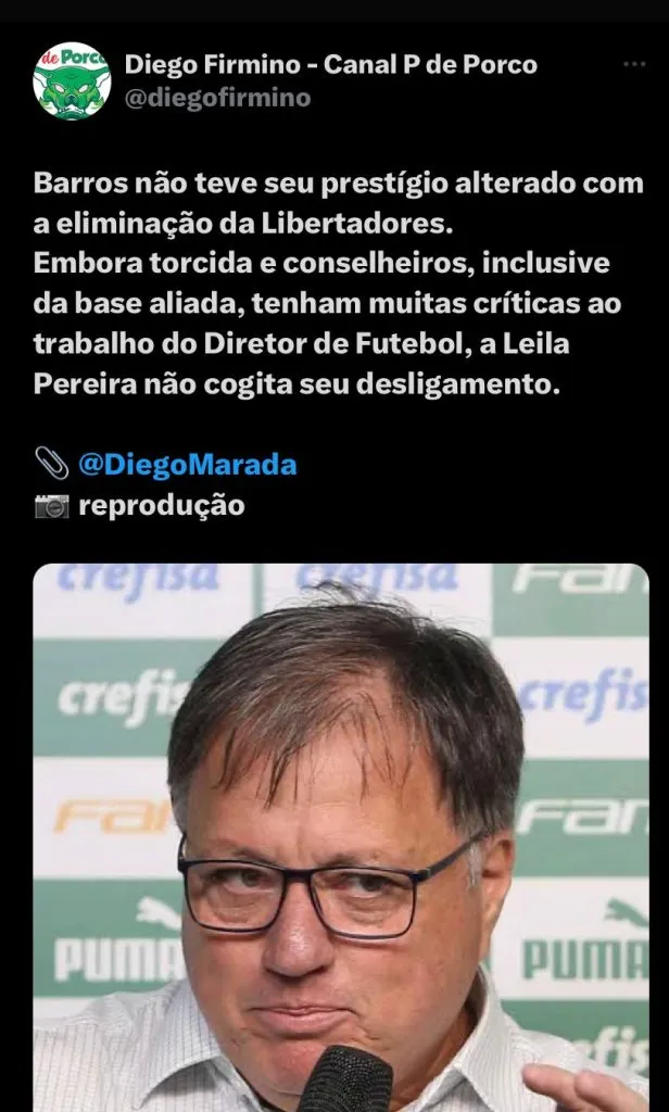 Segundo Diego, Leila Pereira não tem a mínima hipótese de demitir o homem de sua confiança: “O diretor de futebol do Palmeiras não teve seu prestígio alterado com a eliminação. Embora a torcida e conselheiros, inclusive da base aliada, tenham muitas críticas ao trabalho de Anderson Barros, Leila Pereira não cogita seu desligamento. Ao contrário do que muitos imaginam, Anderson não tem um contrato por jornada, como os técnicos e jogadores. De modo que seu desligamento não geraria multa para além do que é estipulado na CLT. Assim, sua saída seria simples, se fosse o desejo da presidente. Mas não é o caso. A avaliação é de que Anderson, junto com o departamento de análise, fizeram o melhor possível para identificar nomes e oportunidades de reforços, tendo sido brecados por valores que assustaram ou reprovação por parte de Abel”, disse o jornalista em sua coluna no Trivela.