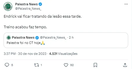 Por mais que o caso de Endrick não pareça ser grave, a torcida demonstrou preocupação nas redes sociais. Para garantir mais uma taça na Academia de Futebol, a jovem promessa será essencial no esquema tático de Abel Ferreira, ainda mais pela ausência de Rony.