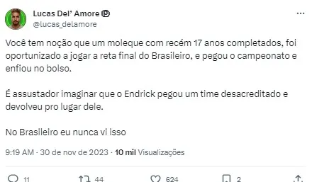 Um dos autores dos gols e atleta principal do time do Palmeiras. Endrick falou sobre a possibilidade do time garantir o título, diante da ampla vantagem sobre os demais adversários.