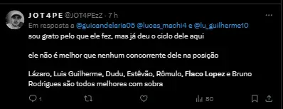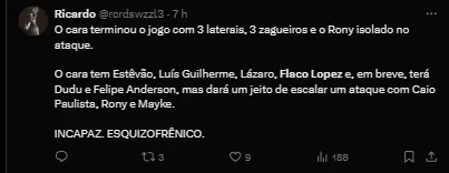 Para começar, o comandante explicou que apesar de flutuar, quem estava mais recuado era Endrick. “O López não jogou como meia-atacante, foi o Endrick. O López poderia flutuar ali. O Lázaro do lado esquerdo e do direito o Endrick flutuava”, explicou Abel.