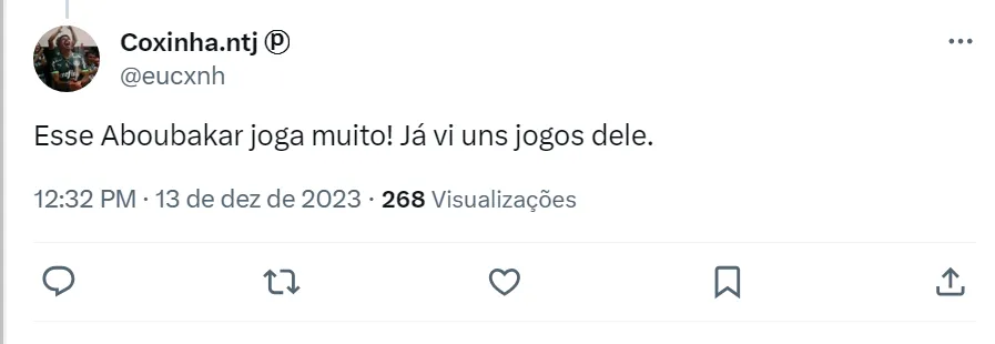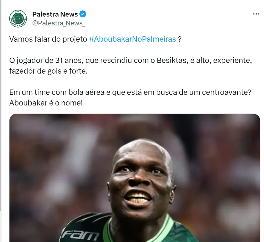 O Verdão vai perder Endrick, tendo em vista que o atacante vai se transferir para o Real Madrid, da Espanha, no meio do ano que vem. Os torcedores do Palmeiras acreditam que Aboubakar seria uma boa peça de substituição.