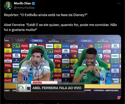 O comandante português encerrou sua fala relembrando que falou o mesmo sobre ir para Disney para Endrick e hoje o camisa 9 está negociado com o Real Madrid. “Então, o que eu digo a ele e às minhas filhas é: tudo no tempo de Deus. Sejam felizes. Quando tiver que ir à Disney, vá, porque o outro (Endrick) foi e foi vendido ao Real Madrid”, completou Abel.