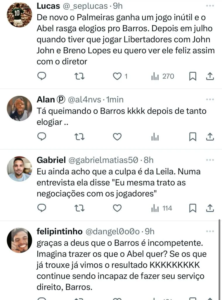 “De novo o Palmeiras ganha um jogo inútil e o Abel rasga elogios pro Barros. Depois em julho quando tiver que jogar Libertadores com John John e Breno Lopes eu quero ver ele feliz assim com o diretor”, avaliou um membro da torcida.