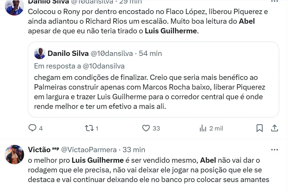 “Abel, por que você tirou o Luís Guilherme que estava se destacando na partida para por o Rony?”, questionou um fã palestrino na sequência. “Eu duvido que se fosse ao contrário, ele tiraria o Rony no intervalo”, completou outro torcedor.