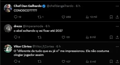 Abel ainda disse que ele é muito diferente e que precisa contar com o atleta até a temporada de 2027. “Deixe ele ficar com a gente até 2027. Acho mesmo que esse jogador é diferente de tudo que eu já vi. Defende, ataca, se mostra para o jogo. Falem disso”, disse o técnico.