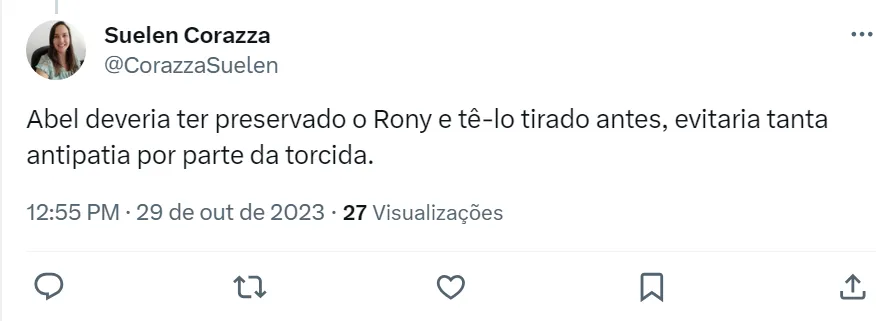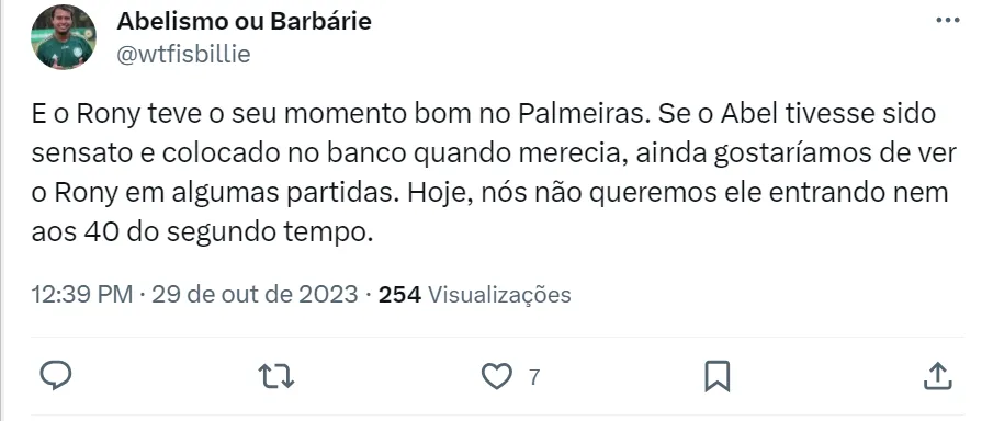 Com tudo que foi exposto pelo Abel, Rony vai ter que lutar nos treinamentos para retomar a sua titularidade no Palmeiras. Atualmente, o ataque do Verdão vem sendo formado por Breno Lopes e Endrick.