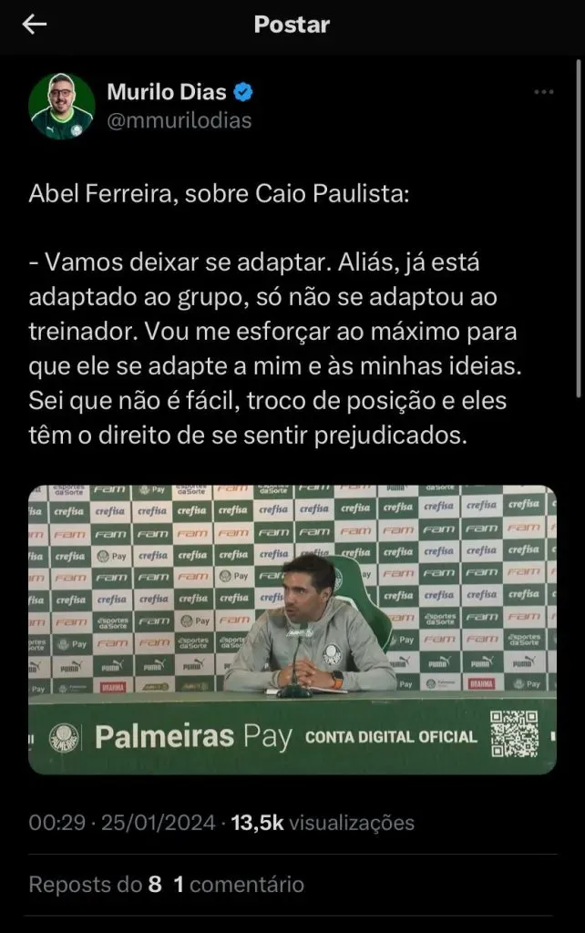 Nas redes sociais, a torcida do Palmeiras comentou as falas do treinador: (SIC) “ “Futuro”, maluco de 25 anos com 5 anos de contrato”; “Polivalência dele me assusta um bocadinho também, é ruim em todas as posições que joga”; “Ele sente tesão em improvisar os atletas. É sádico, gosta de ver os caras se matando pra fazer o que eles não sabem”, comentários de alguns torcedores.