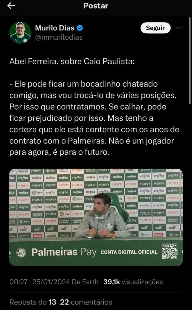 Ainda na coletiva após a partida, Abel falou mais um pouco sobre o reforço, enfatizando a forma que deverá utilizá-lo, deixando claro que ele é um jogador para o futuro do time, que isso pode até causar chateação no atleta.