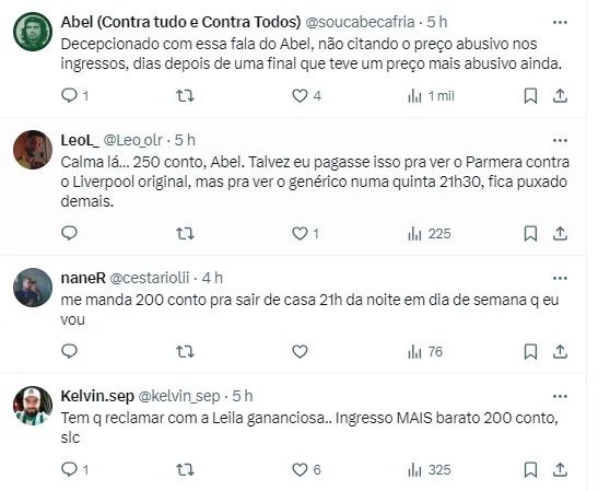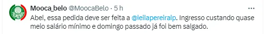Abel, inclusive, fez uma comparação até com jogos da Sula: “Ontem vi jogos da Sul-Americana com estádio cheio… Isso é Libertadores. Nossas vitórias em casa são 30% deles. Hoje só tivemos 15%. Senti falta daqueles que não vieram”, completou.