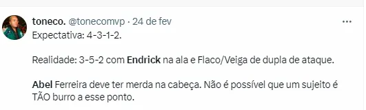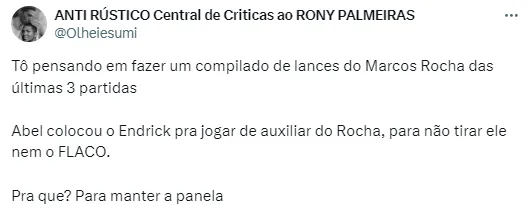 Inclusive, Abel vem sendo muito importante neste momento. O português vem tentando implementar estratégias para potencializar seu desenvolvimento nesta reta final da passagem do atleta pelo Verdão.