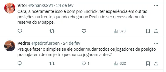 “Endrick não é o que espero, é o que nós esperamos. Eu disse que precisava perceber como ele vinha depois de vir da Seleção e acho que ele percebeu o recado que dei publicamente, porque mal chegou, antes de treinar, veio falar comigo”, afirmou.