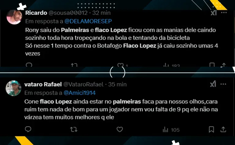 “Enquanto Raphael Veiga e Flaco López continuarem a serem titulares do ataque do Palmeiras, sem reforço pra tirar a vaga desses caras, o futebol do Palmeiras vai continuar essa porcaria aí”, criticou.