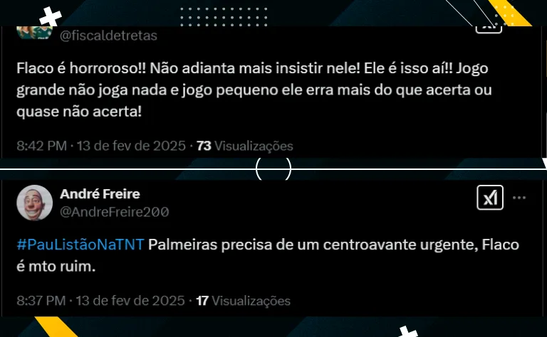 Além de criticar o desempenho do jogador, a torcida ainda reprova a movimentação da diretoria no mercado por reforços. “Flaco fez gol e já sabem né? amanhã sai na mídia que o Palmeiras desistiu do Vitor Roque porque está satisfeito com o Flaco López”, escreveu.