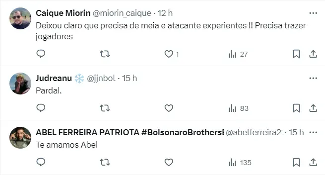 “E quero dizer que eu já não vou contratar mais ninguém, já contratamos os jogadores, que fiquem tranquilos e vem dar a vida quando vem jogar aqui contra o Palmeiras, calma”, falou Abel, sorrindo.