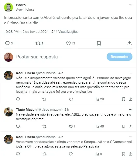 “Impressionante como Abel é reticente pra falar de um jovem que lhe deu o último Brasileirão”. “Na verdade, ele não é reticente, ele, Abel, precisa, sentir que é o maior e o destaque do time”, comentaram alguns torcedores.