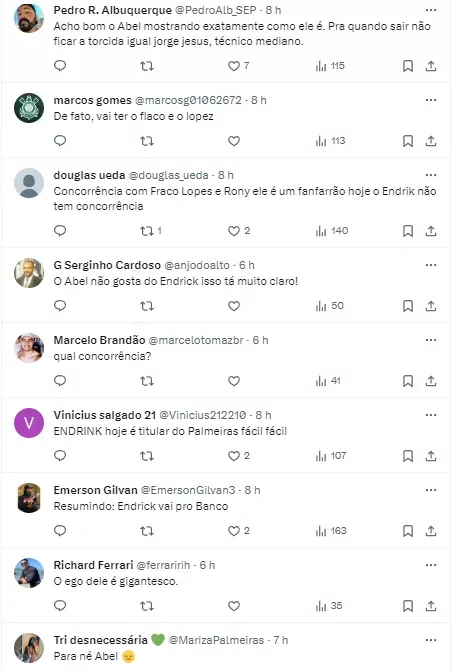 “Concorrência com Fraco Lopes e Rony ele é um fanfarrão. Hoje, o Endrik não tem concorrência”. “O Abel não gosta do Endrick, isso tá muito claro”. “Endrick hoje é titular do Palmeiras fácil, fácil”, destacaram outros palmeirenses.