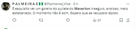 Não bastasse isso, depois das muitas críticas que sofreu dos palmeirenses, em que alguns dos torcedores já perderam a paciência e querem a saída dele do time titular, o arqueiro trancou os comentários em suas redes sociaispara não ler as críticas que vinham sendo comentadas em suas postagens.