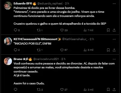 Leila Pereira também confirmou que do lado palmeirense também existe essa ideia do acerto. “Eu aprovei, o Cruzeiro deu o ‘ok’ também e aí aconteceu o imbróglio que o Dudu falou que ia e depois não ia mais. Ele tem um compromisso e eu espero que ele honre. Pelo Palmeiras, o Dudu está vendido. Eu preciso da assinatura dele”, pontuou.