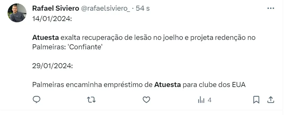 Há pouco, o jornalista Thiago Ferri, do Globo Esporte, informou que Atuesta está de saída do Palmeiras. O colombiano de 26 anos negocia um empréstimo com um clube dos EUA.