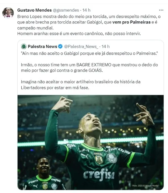 Em contrapartida, outra situação gerou polêmica, mas no Rio de Janeiro: pelo jogo de ida das semifinais da Copa do Brasil, Gabigol acabou sendo substituído no segundo tempo e saiu debaixo de vaias no Maracanã. Em decorrência disso, após uma publicação nas redes sociais, dizendo “Faltam 90 minutos, eu acredito!”, o camisa 10 recebeu de uma invasão de pedidos: “Vem pro Palmeiras”.