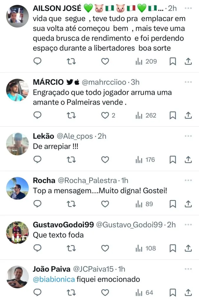 “Agora serão 6 horas na frente. Mas não importa. Seguirei acompanhando o meu porco meu único amor”. Obrigado Sociedade esportiva Palmeiras”, concluiu.
