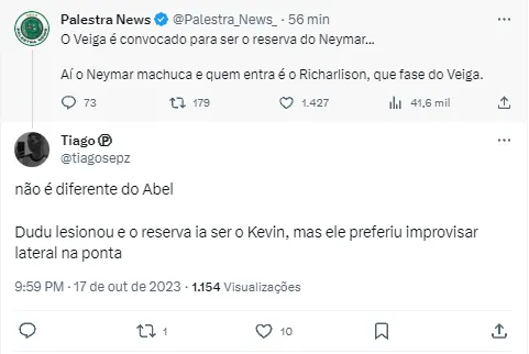 Isso porque a torcida do Palmeiras acreditou que Raphael Veiga seria o melhor nome para substituir Neymar após o atacante sofrer séria lesão no joelho. Entretanto, mesmo atuando no setor do campo em que o camisa 10 estava, Veiga não foi o escolhido por Diniz. O técnico da Seleção Brasileira colocou o atacante Richarlison no lugar, o que acabou virando motivo de revolta na web.