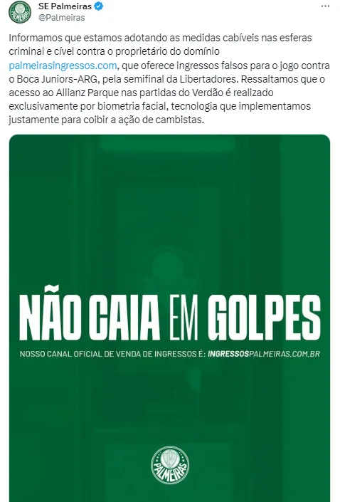 Nesta segunda-feira (2), o Palmeiras emitiu uma nota oficial revelando que vai colocar na Justiça, nas esferas cíveis e criminais, um site que vende ingressos falsos para a semifinal da Libertadores. Segundo o posicionamento oficial do Clube, o domínio palmeirasingressos.com estaria disponibilizando entradas não legítimas para o confronto de volta diante do Boca Juniors. Por se tratar de um assunto que traz prejuízo financeiro e de reputação do Clube, o comunicado foi feito em tom de alerta.