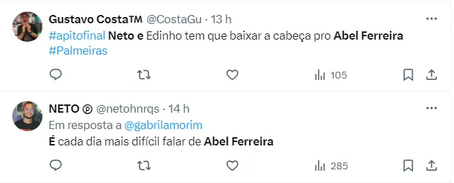 Após o título do Palmeiras, Neto e Abel Ferreira tiveram a oportunidade de conversar ao vivo, o apresentado do estúdio da Band, no programa Apito Final, e o treinador direto do gramado do Allianz Parque.