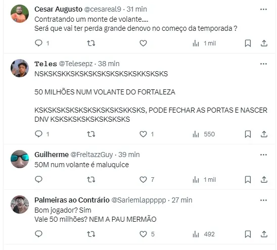 Segundo apurado pela mesma fonte, a direção do Fortaleza pretende negociar Caio Alexandre somente se o valor for na casa dos R$ 50 milhões para que o Clube fique ao menos com R$ 25 milhões.
