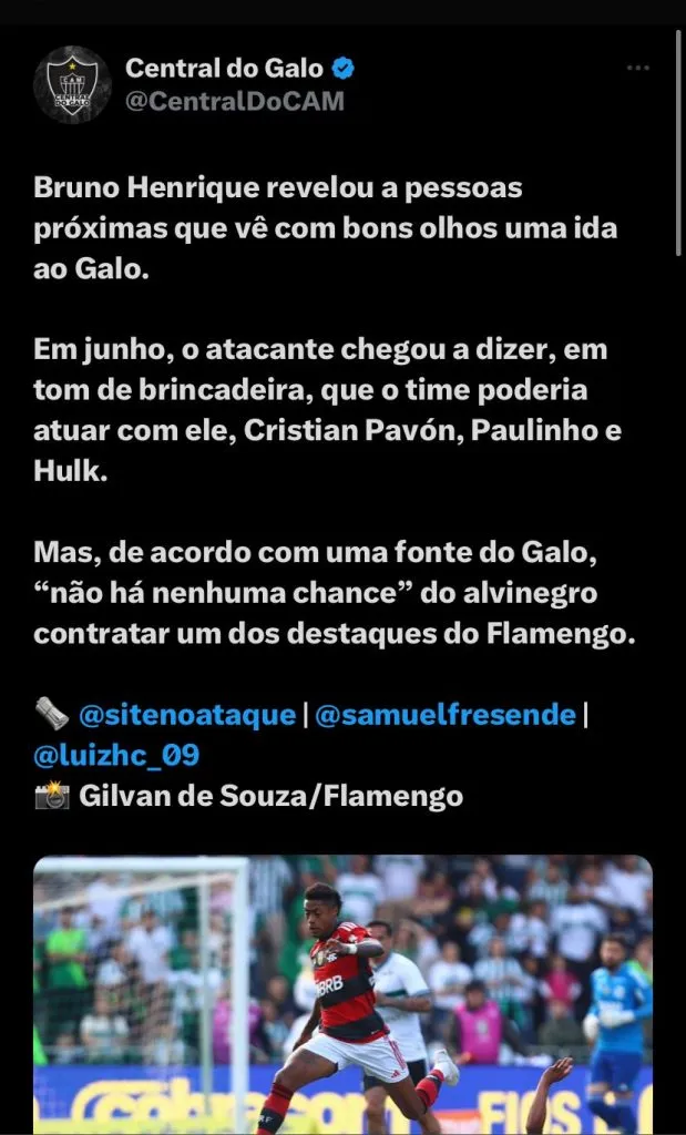 Segundo informado, o jogador que é natural da capital mineira, revelou a pessoas próximas que vê com bons olhos sua ida ao Atlético Mineiro, ou seja, o Palmeiras pode perder o BH para o Galo. Ainda de acordo com a fonte, em junho, Bruno chegou a brincar sobre atuar com Hulk, Paulinho e Pavón, porém, apesar do interesse do jogador, uma fonte ligada ao Clube mineiro, informou que não há chances disso no momento.