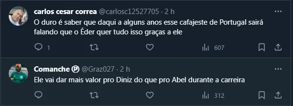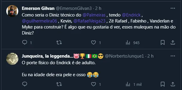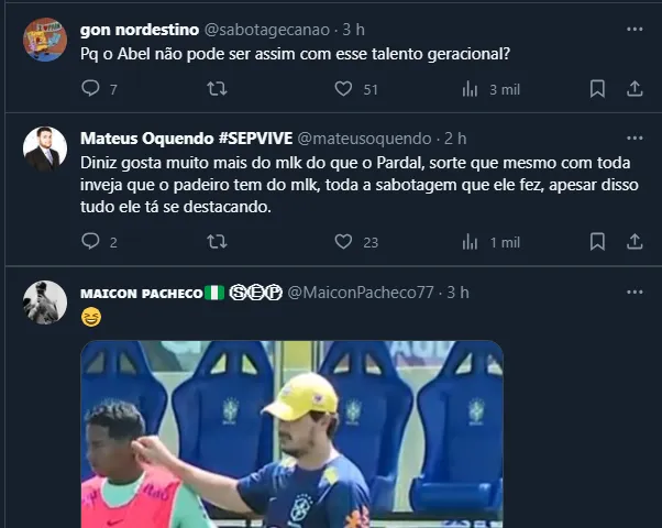 Nesta quarta-feira (15), inclusive, o atacante foi flagrado ao lado de Fernando Diniz e um “puxão de orelha” do professor chamou atenção nas redes sociais. Não à toa, torcedores aproveitaram a boa relação para questionar Abel Ferreira, que não costuma “brincar” tanto com o craque.