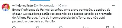 Há cerca de 10 dias, um profissional de arbitragem que trabalhou no Allianz Parque em um jogo amistoso, ele disse que teve um problemas com o gramado, acabou levando a uma lesão.