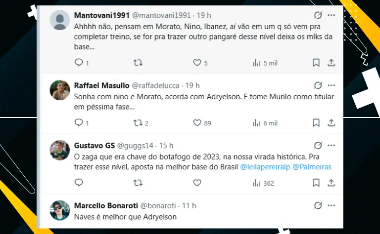 Para encerrar, embora tenha feito história pelo Botafogo, Adryelson não teve seu nome tão aprovado pelos palmeirenses. A maior parte criticou a possível investida no defensor. Veja alguns comentários na web: