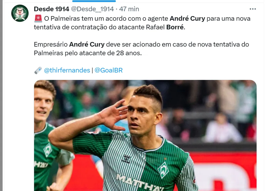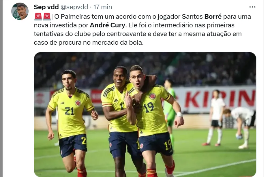 É um atleta que pode atuar de centroavante ou mesmo como ‘segundo atacante’. O colega Thiago Fernandes, da GOAL, apurou ainda que o Palmeiras tem um acordo com o empresário André Cury para uma nova investida por Borré.