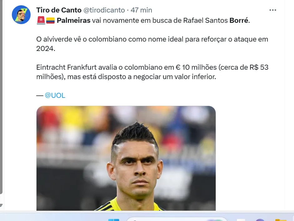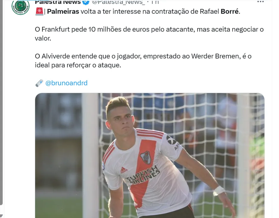 Só que a agressividade do Palmeiras 2024 não deve parar por aí. Há pouco, os colegas Bruno Andrade e Marcelo Hazan, do UOL Esporte, informaram que o centroavante Rafael Borré, do Eintracht Frankfurt, voltou a ser procurado.