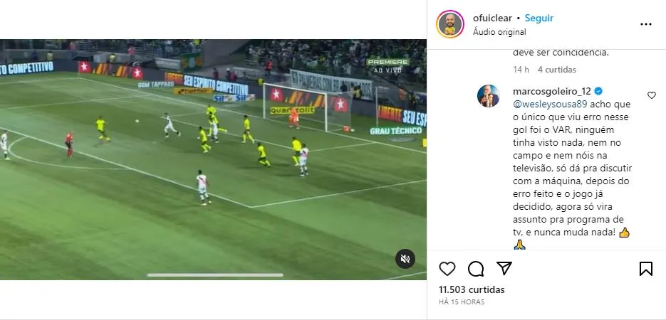 Entretanto, o ex-goleiro e eterno ídolo do Palestra, Marcos, não se calou sobre o lance e após uma postagem na página do comunicador Fui Clear, o ídolo tocou o dedo na feria ao abordar o lance. Como sempre, Marcão foi direto ao ponto e deixou bem claro que não tem uma visão clubista sobre o fato.
