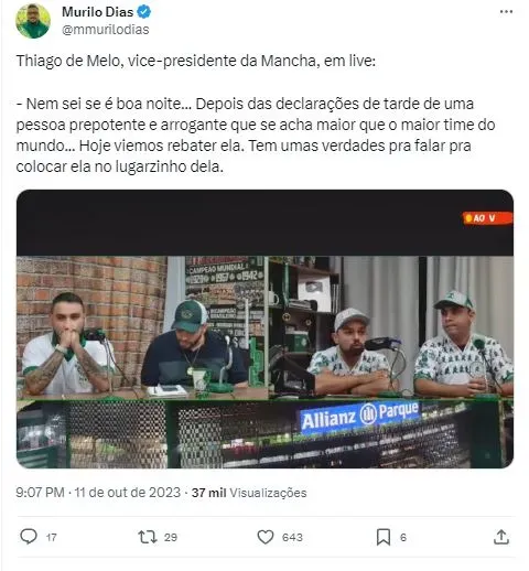 “Não estamos aqui para falar da Mancha. Ela (Leila Pereira) falando e o cachorro vira-lata cagand… é a mesma coisa, a mesma merda. Agora, do Palmeiras não! Estamos aqui porque ela mij… e chutou a imagem do Palmeiras!”, afirmou, para na sequência, comentar sobre os atos que tiveram as lojas da Crefisa como alvo de protesto.