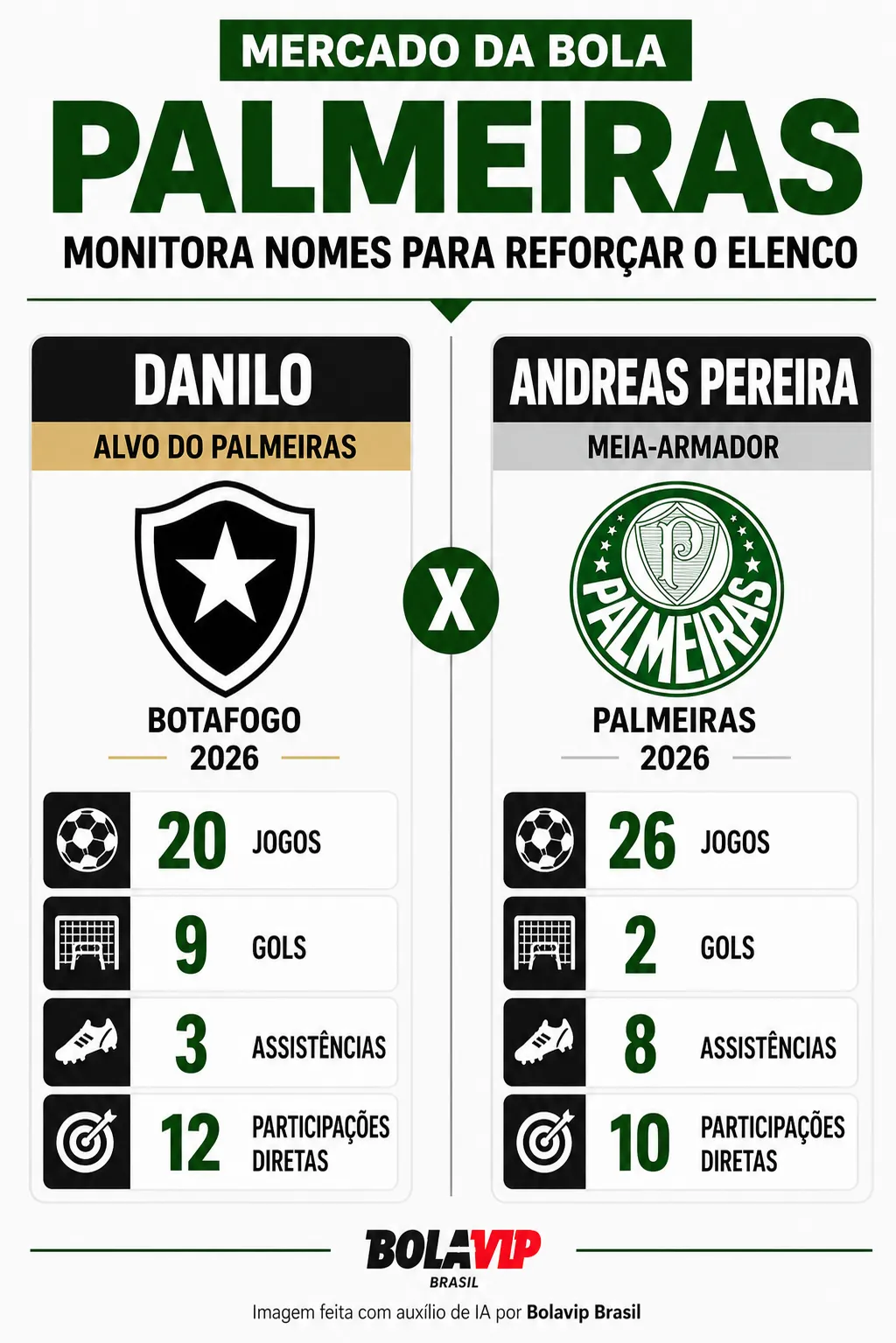 Um dos alvos do Palmeiras para a próxima janela, Danilo apresenta números superiores aos de Andreas Pereira. Destaque do Botafogo em 2026, o volante soma nove gols e três assistências em 20 jogos, totalizando 12 participações diretas.