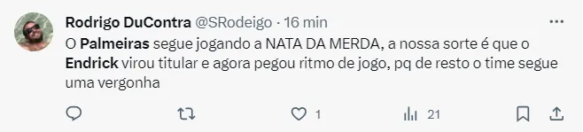 O camisa 9 mudou o rumo da partida, sendo decisivo nos gols que levaram a partida para os pênaltis. Infelizmente a classificação não veio, mas para Abel e para a torcida, o jogo serviu de lição para elucidar que Endrick não poderia ser mais reserva do Palmeiras.