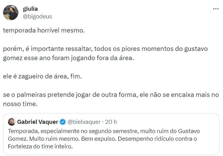 Assim, é natural que Gómez tenha ‘mais trabalho’. Porém, isso não justifica um capitão sendo expulso em dois jogos consecutivos, colocando em risco uma possível segurança do Palmeiras na reta final do Brasileiro. O Palmeiras enfrenta o América-MG, nesta quarta-feira (29).