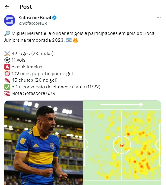Merentiel foi destaque em 23 dos 42 jogos que disputou até aqui. O argentino soma 11 gols e cinco assistências. Com esses números, ele precisa de pouco mais de uma partida para participar de um tento dos Xeneize, segundo dados do Sofascore. O jogador jogou contra o Verdão na semifinal da Libertadores e mostrou eficiência.