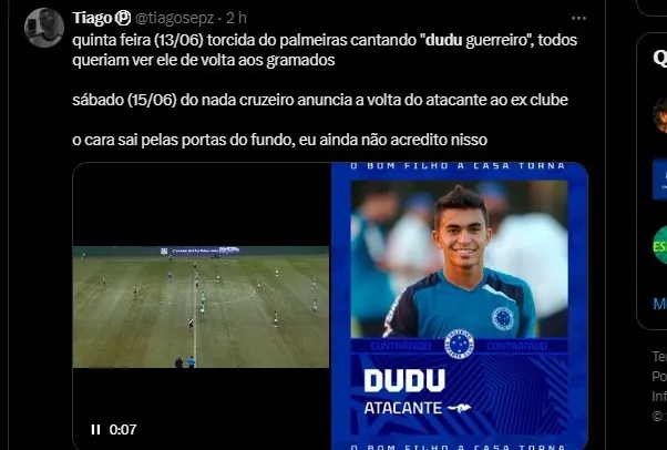 Na tarde deste sábado, o Cruzeiro anunciou a contratação do atacante Dudu por 4 temporadas. A notícia pegou o futebol brasileiro de surpresa. Além disso, o técnico Abel Ferreira contava com o atacante para a partida decisiva de O camisa 7 estava no banco de reservas na vitória de 2 x 0 contra o Vasco em duelo válido pela oitava rodada do Brasileirão 2024.