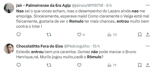 O que mais uma vez chamou a atenção dos palmeirenses foi a não utilização do meia Rômulo. Abel Ferreira não abriu mão de Raphael Veiga, que atua na mesma faixa de campo que Rômulo, mesmo o jogador pouco produzindo.