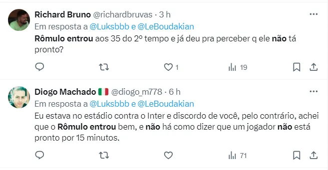 Rômulo não entrou um minuto sequer contra o Flamengo, e viu companheiros como Lázaro ganhar oportunidade no jogo, mas pouco ser efetivo. Contra o Internacional, o jogador havia ganhado apenas 15 míseros minutos para atuar.
