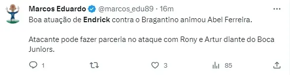 Sua atuação envia uma mensagem a Abel Ferreira de que Endrick pode ser uma alternativa valiosa no decisivo confronto da próxima quinta-feira, às 21h30, diante do Boca Juniors, pela semifinal da Conmebol Libertadores. Em uma coletiva de imprensa após a partida do último domingo, o treinador encheu o jogador de elogios e explicou que a razão de não tê-lo utilizado mais nos jogos recentes estava relacionada ao seu posicionamento em campo, onde ele se destaca.