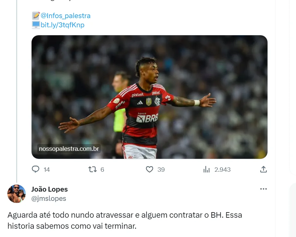 Vale lembrar que o Verdão deseja a contratação de Bruno Henrique, que está em fim de contrato com o Flamengo. O portal Nosso Palestra ainda informou que o Palmeiras aguarda uma reunião do time carioca com representante do experiente jogador para avançar em um possível acordo. BH deseja um alto salário e contrato entre dois e três anos para fechar com qualquer time.